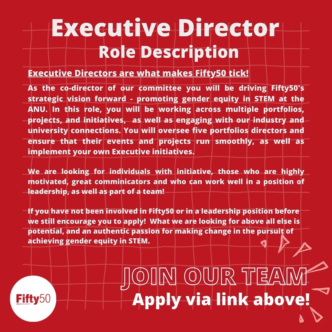 Fifty50 is a student-led organisation which promotes gender equity in science, technology, engineering, and maths (STEM) within the ANU.